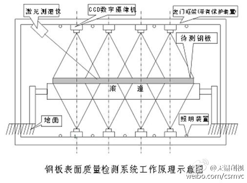 钢板表面质量检测系统基于机器视觉技术和数字图像处理技术,应用激光测速技术结合摄影测量技术完成钢板上下表面的缺陷检测,其工作原理如下图所示。