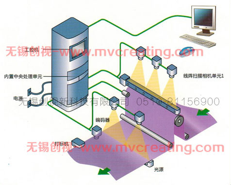 ℱ     使用“背光” 成像方式,通过架设在生产线上的CCD线阵相机进行实时同步扫描,CCD将采集到的图像数据传输给视觉检测软件MVC多功能图像处理软件,通过软件对带钢表面图像特征进行分析判断,从而进行实时检测、分类和处理各种针孔、边裂等缺陷,其结构原理图如下: